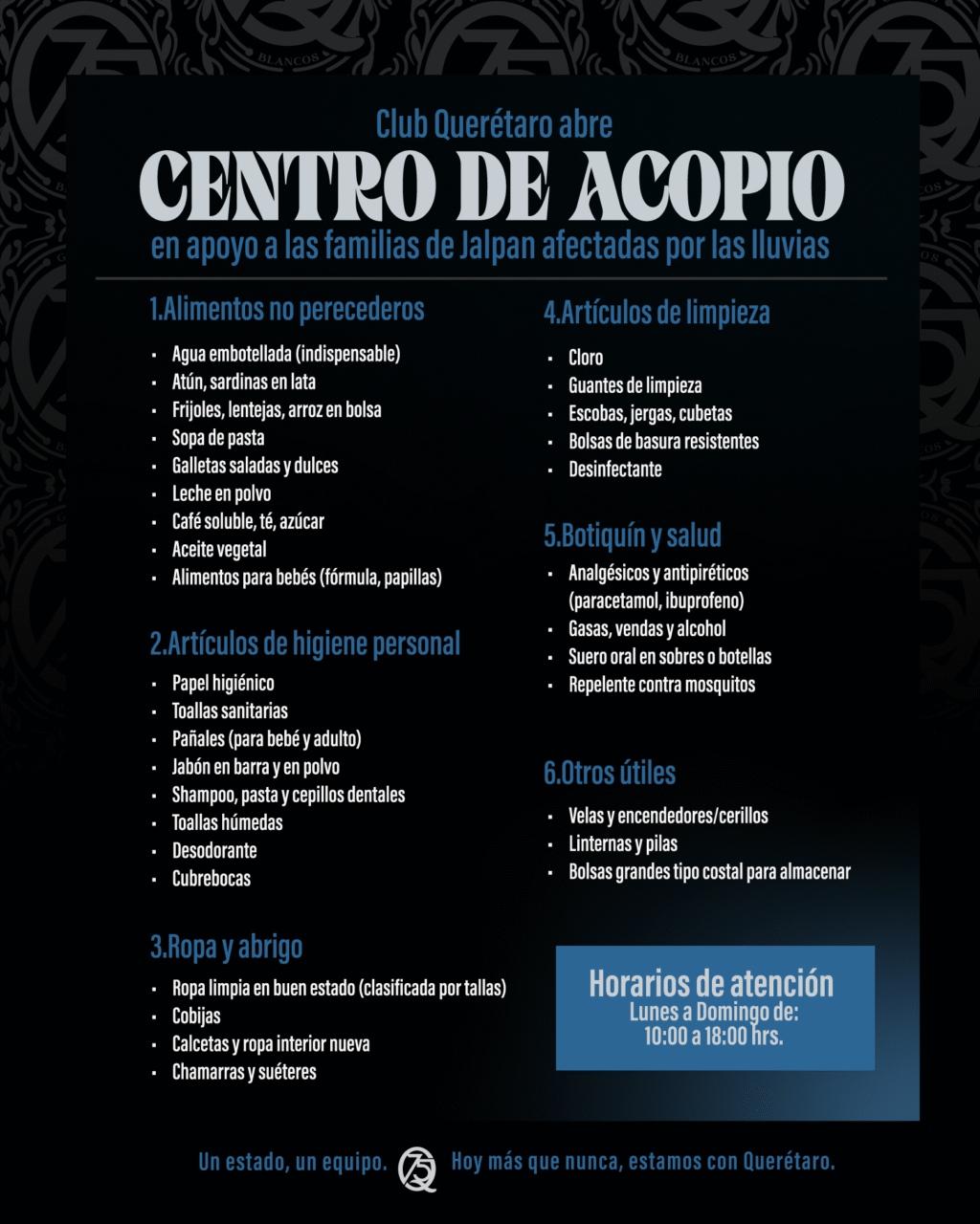 CENTRO DE ACOPIO (En apoyo a las familias de Jalpan) Post navigation Anterior Querétaro femenil ganó en casaSiguiente Querétaro Femenil ganó en Mazatlán